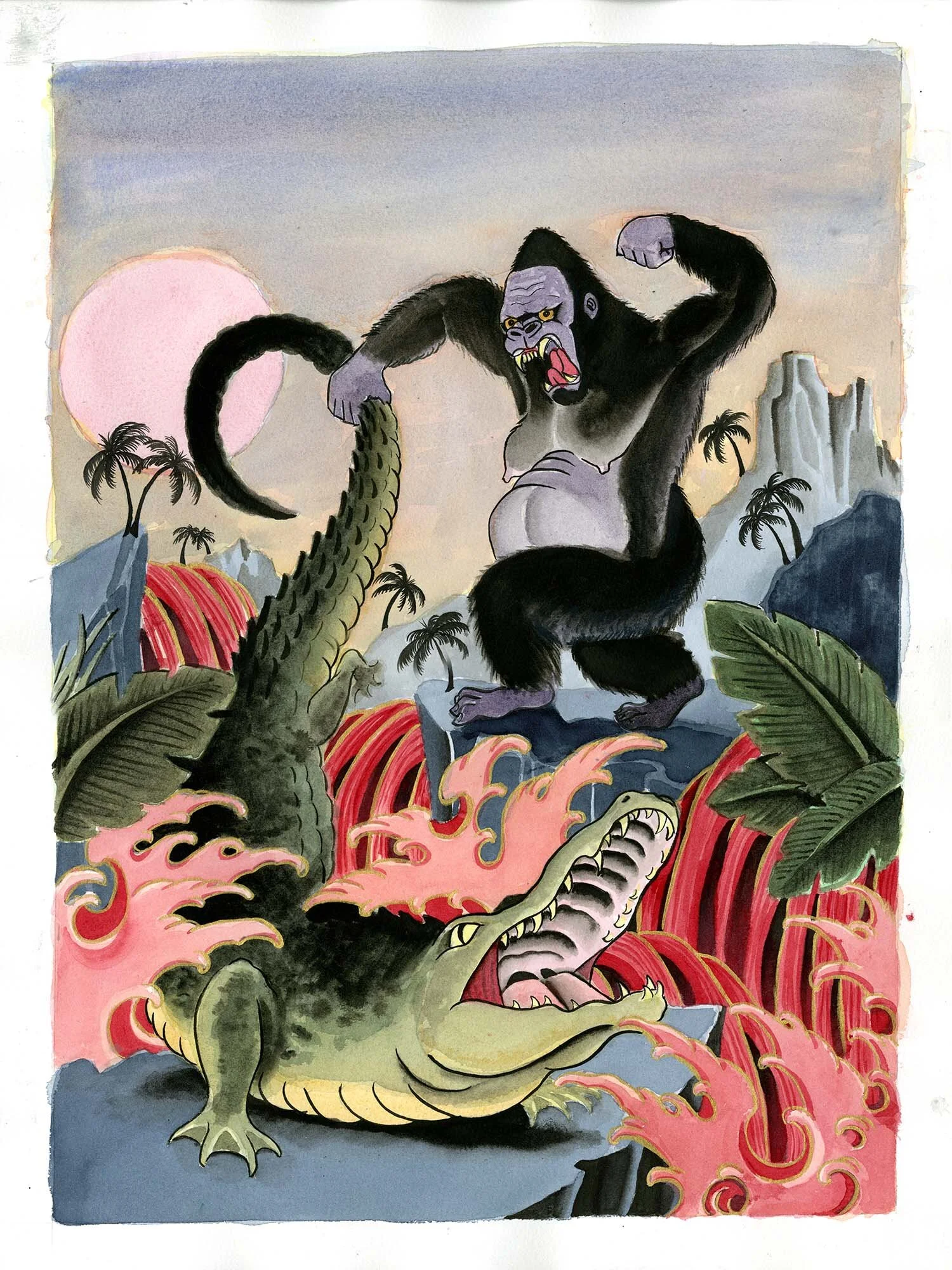 Kong was designed for use as a poster or album art. Here he is depicted in battle with a ferocious crocodile. He must defend his seat on the throne if he wants to keep his crown. This poster has elements of Japanese woodblock prints often used in tattoo. Watercolor, ink, gouache, on watercolor paper 14.75”x20.”